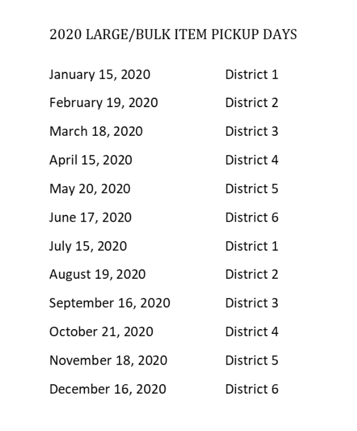 THE NEXT LARGE/BULK ITEM PICK UP WILL BE FOR DISTRICT 2 ON WEDNESDAY, AUGUST 19, 2020.
