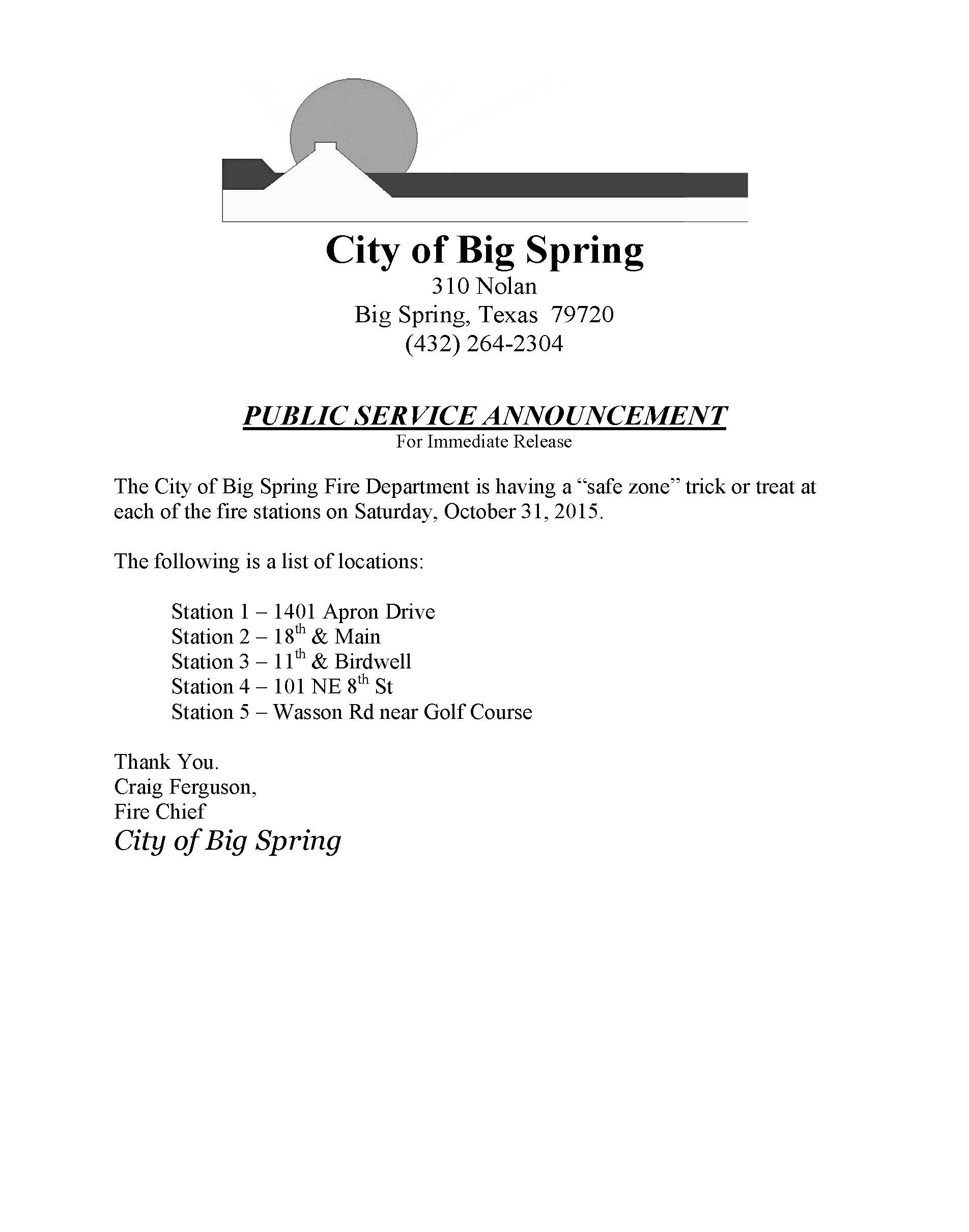 Pubic Notice May 26, 2016 - Memorial Day Observance (PDF) Public Notice May 23, 2016 - Power Outage at the Water Plant (PDF) Public Notice May 16, 2016 - Water Line Replacement (PDF) Public Notice May 16, 2016 - Street Seal Coat Project (PDF) Public Notice May 6, 2016 - Use Caution in the Area (PDF) Public Notice May 6, 2016 - Cinco De May Celebration (PDF) Public Notice April 22, 2016 - Water Line Tie Ins (PDF) Public Notice April 22, 2016 - Golf Course Aeration (PDF) Public Notice March 24, 2016 - Good Friday Observance (PDF) Public Notice March 22, 2016 - Road Closure (11th Place and Donley) (PDF) Public Notice March 17, 2016 - CGG Seismic Study in Howard County (PDF) Public Notice February 24, 2016 - Birdwell Lane Line Repair (PDF) Public Notice February 18, 2016 - Water Line Replacement (PDF) Public Notice February 12, 2016 - Water Line Replacement (PDF) Public Notice February 12, 2016 - President's Day Observance (PDF) Public Notice February 10, 2016 - Water Line Replacement (PDF) Public Notice February 9, 2016 - Water Line Replacement (PDF) Public Notice January 27, 2016 - Water Line Replacement (PDF) Public Notice January 27, 2016 - Street Maintenance (PDF) Public Notice December 22, 2015 - City Sanitation Pickup Schedule (PDF) Public Notice December 22, 2015 - City Offices Holiday Schedule (PDF) Public Notice November 23, 2015 - Thanksgiving Holiday Observance (PDF) Public Notice November 13, 2015 - Road Closure, Sgt. Paredez Street (PDF) Public Notice November 10, 2015 Fog Seal Project (PDF) Public Notice November 10, 2015 - Veteran's Day Observance (PDF) Public Notice November 5, 2015 - E-Waste Collection (PDF) Public Notice November 3, 2015 - Water Valve Replacement at WTP (PDF) Public Notice November 2, 2015 - Water Office Closing (PDF) Public Notice October 29, 2015 - Street Closure for Trunk or Treat (PDF) Public Notice October 27, 2015 - BSFD Halloween Safe Stop Trick or Treat (PDF) Public Notice October 19, 2015 - Comanche Trail Park to Close for Cross Country Meet (PDF) Public Notice October 15, 2015 - City Offices to Close for Employee Picnic (PDF) Public Notice October 14, 2015 - Sanitation Route Changes (PDF) Public Notice September 30, 2015 WWTP Renewal Notice (PDF) Public Notice September 21, 2015 - Water Line Repair (PDF) Public Notice September 8, 2015 - Comanche Trail Park Closing for Triathalon (PDF) Public Notice September 4, 2015 - Labor Day Observance on September 7, 2015 (PDF) Public Notice August 20, 2015 - Water Billing Error (PDF) Public Notice August 20, 2015 - Birdwell Lane Closure for Crosswalk Maintenance (PDF) Public Notice August 12, 2015 - Painting Crosswalks (PDF) Public Notice August 6, 2015 - Water Line Replacement (PDF) Public Notice August 4, 2015 - Water Line Repair (PDF) Public Notice July 23, 2015 - Utility Construction Work Zone (PDF) Public Notice June 26, 2015 - Aquatic Center Closing for Pops in the Park (PDF) Public Notice June 11, 2015 - North Side Water Tower Repair (PDF) Public Notice June 10, 2015 - North Side Water Tower Leak (PDF) Public Notice May 20, 2015 Comanche Trail Park Event Closure (PDF) Public Notice April 27, 2015 Valve Replacement (PDF) Public Notice March 26, 2015 - TECQ Quality Report (PDF) Public Notice March 16, 2015 - 12 Inch Valve Repair (PDF) Public Notice March 13, 2015 - Surface Water Monitoring Notice, Spanish Version (PDF) Public Notice March 13, 2015 - Surface Water Monitoring Notice (PDF) Public Notice March 12, 2015 - Cancellation of Boil Water Notice (PDF) Effective as of March 12, 2015 - Surface Water Monitoring (PDF) Public Service Announcement March 10, 2015 - Boil Water Notice (PDF) Public Notice March 10, 2015 - Comanche Trail Park Reservoir (PDF) Public Notice March 10, 2015 - Boil Water Notice (PDF) Public Notice February 24, 2015 - Sewer Line Replacement (PDF) Public Notice February 13, 2015 - President's Day Observance (PDF) Public Notice January 16, 2015 - Martin Luther King Jr. Day Observance (PDF) Public Notice January 2015 - Notice of Surface Water Treatment Technique Violation, Spanish Version Public Notice January 2015 - Notice of Surface Water Treatment Technique Violation (PDF) Public Notice December 30, 2014 - Reporting Street Light Outages (PDF) Public Notice December 30, 2014 - Holiday Tree Disposal (PDF) Public Notice December 16, 2014 - Holiday Closings (PDF) Public Notice December 8, 2014 - Street Repair and Closure (PDF) Public Notice November 13, 2014 - Water Line Replacement Cancellation (Kentucky Way) (PDF) Public Notice November 12, 2014 - Water Line Replacement (Kentucky Way) (PDF) Public Notice November 10, 2014 - Veteran's Day Closing (PDF) Public Notice October 30, 2014 - Trunk or Treat Street Closure (PDF) Public Notice October 30, 2014 - Film Society Movie Night Street Closure (PDF) Public Notice October 2, 2014 - BSHS Homecoming Street Closure (PDF) Public Notice September 23, 2014 - Water Line Replacement (PDF) Public Notice September 18, 2014 - West 6th Street Manhole Repairs (PDF) Public Notice September 18, 2014 - Temporary Street Closure (PDF) Public Notice September 12, 2014 - Water Line Replacement (PDF) Public Notice September 12, 2014 - City Board and Commission Appointments (PDF) Public Notice 2014 Proposed Property Tax Rate (PDF) Landfill Establishing new Fees, September 11, 2014 (PDF) Notice of Public Hearing for 2014-2015 Budget (PDF) Public Notice August 25, 2014 - City of Big Spring Seal Coat Project (PDF) Public Notice July 3, 2014 - City Offices to Close in Observance of Independence Day 2014 (PDF) Public Notice June 27, 2014 - Aquatic Center Closure July 3, 2014 (PDF) (PDF) Public Notice August 8, 2013 - West Nile Virus (PDF) (PDF) Public Notice February 6, 2013 - Street Closure (PDF) Public Notice January 18, 2013 - Holiday Closing (PDF) Public Notice May 12, 2012 - Kid's Zone to Close for Maintenance (PDF)